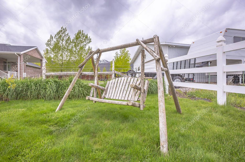 Wooden bench swing at the lush grassy yard of a home with white picket fence