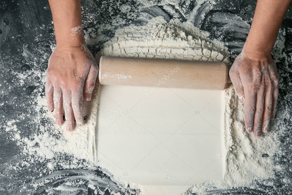 Baker rolling white flour with pin on dark table, closeup. Space for text