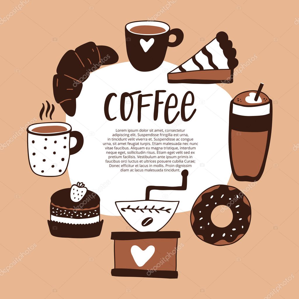 Template of coffee with grinder, cups, croissant and cake. Vector hand-drawn illustration.
