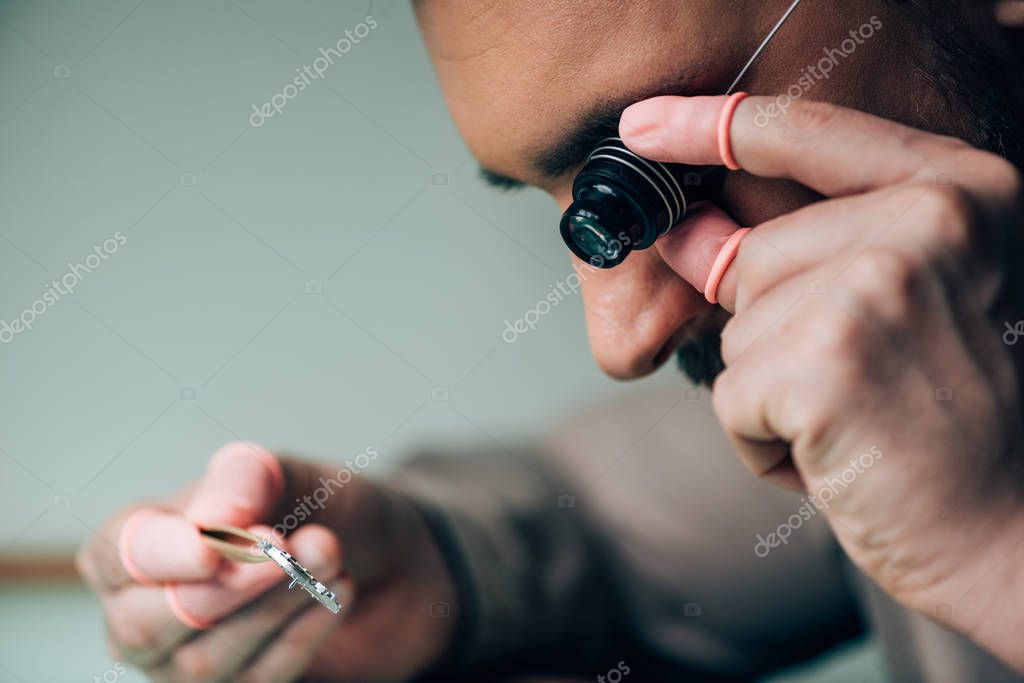 Side view of watchmaker in latex fingertips holding eyeglass loupe and watch part