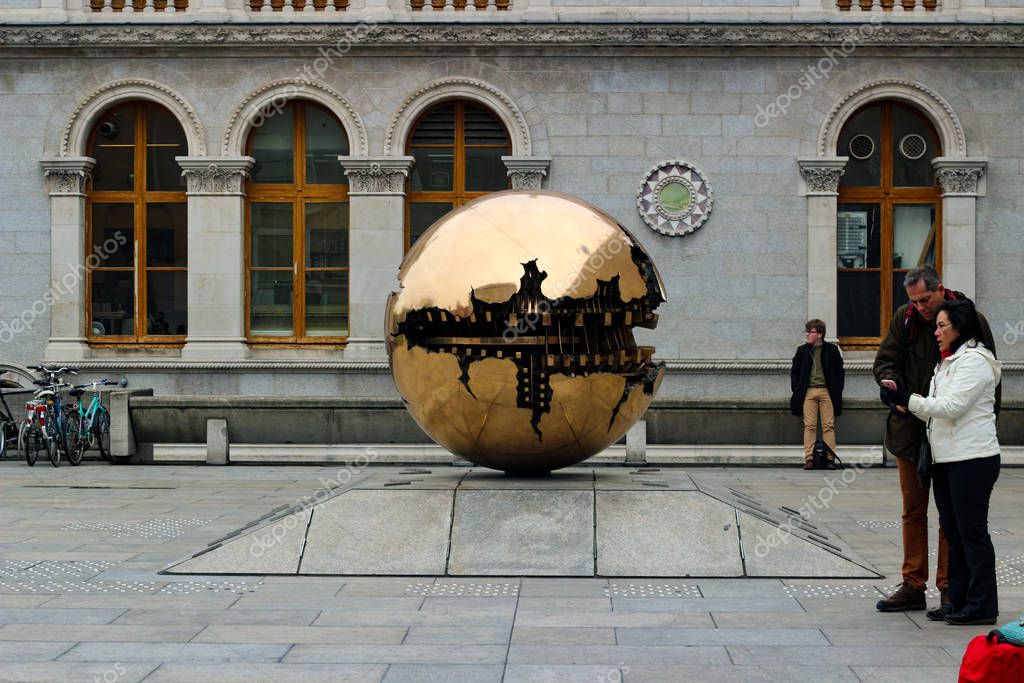 Dublin Ireland, February 18 2018: Editorial photo of tourists looking at the popular "sphere within a sphere"