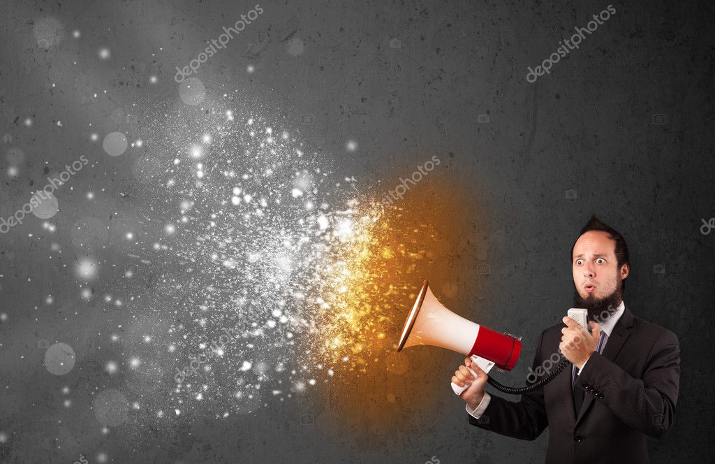 FUN BUSINESS HOLDING PERSON ADULT SUCCESS PORTRAIT CAUCASIAN ENERGY YOUTH POWER EMOTION EXPRESSION CONCEPT IDEA NEWS ANNOUNCEMENT MESSAGE SOUND COMMUNICATE TALKING LIFESTYLE WORK GLOW GLOWING VOICE FINANCE SPEAKER AMPLIFIER LEADER ANGRY GUY LOUD LOUDSPEAKER EXECUTIVE WARNING CRAZY HANDSOME SHOUTING STANDING EXCITEMENT EXPLODE SHOUT SCREAM MEGAPHONE CONFIDENT SPEAKING ENERGETIC BOSS AND