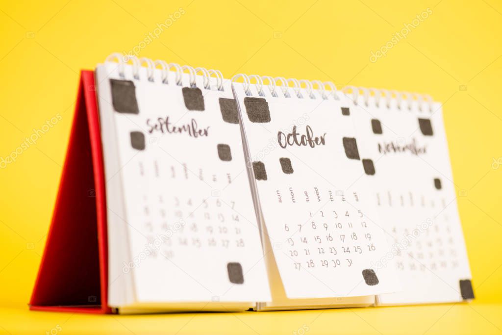 Selective focus of october on paper calendar on yellow background