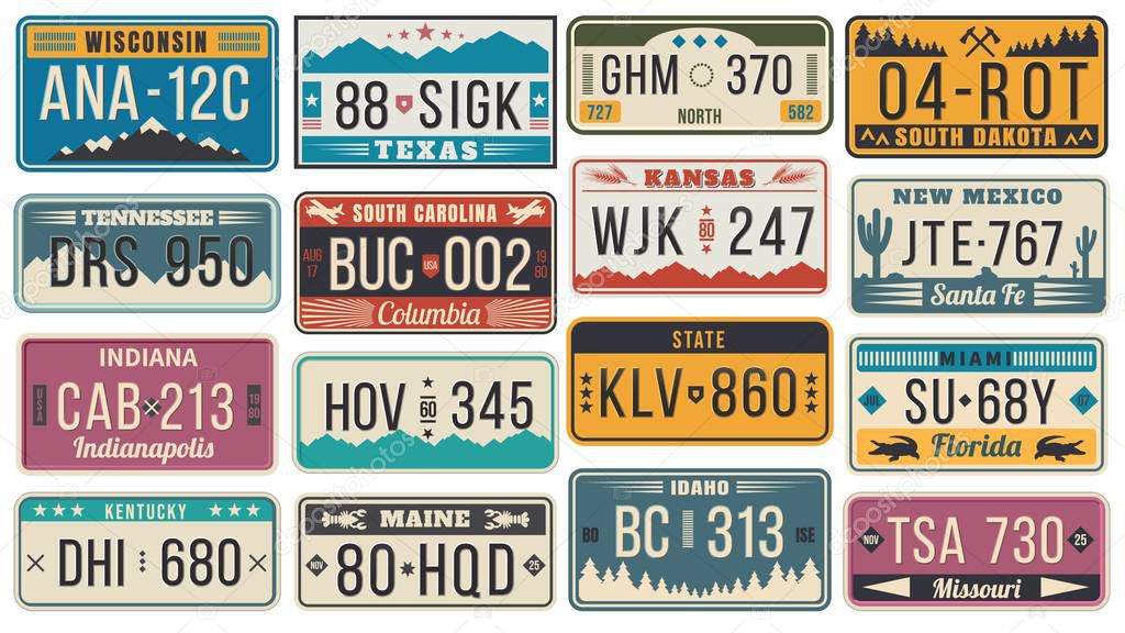 - Abstract USA states license plates. Colorful retro car license, number plate templates vector set