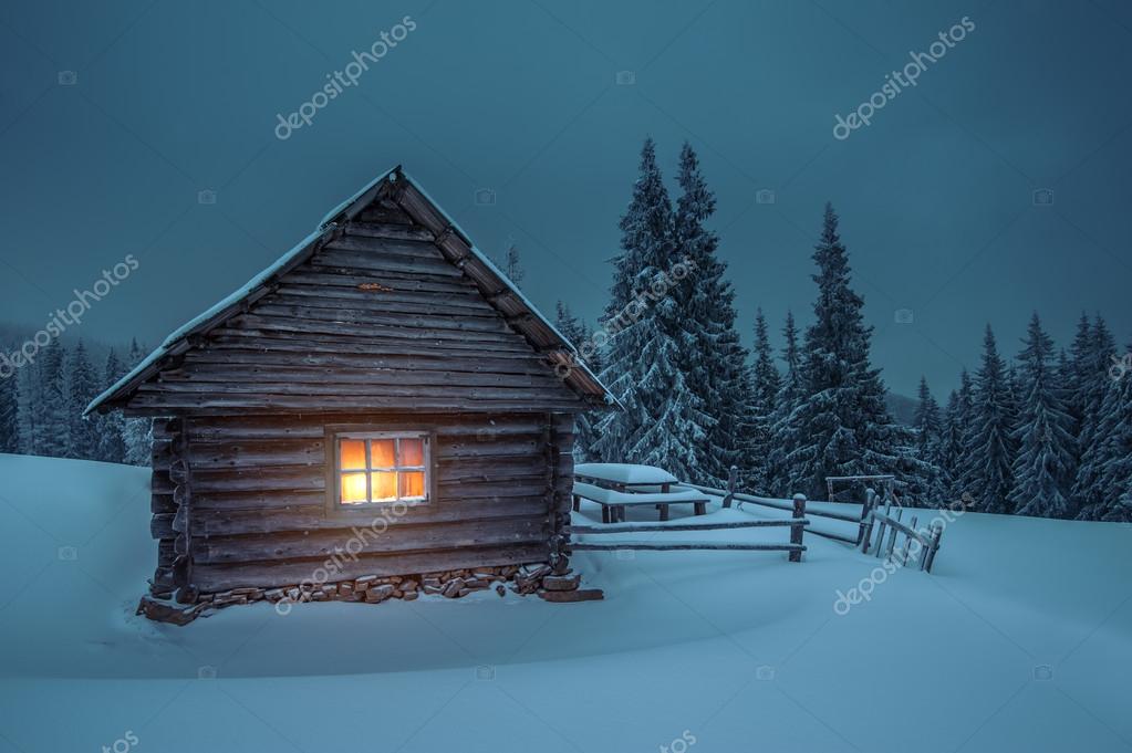 Wooden house in winter forest