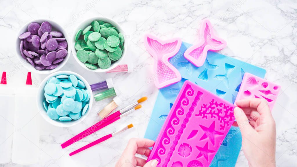 Melting color chocolate chips for making mermaid chocolate molds.