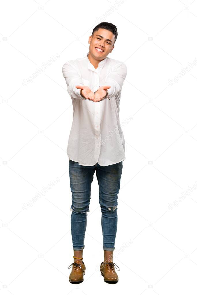 A full-length shot of a Young man holding copyspace imaginary on the palm to insert an ad over isolated white background