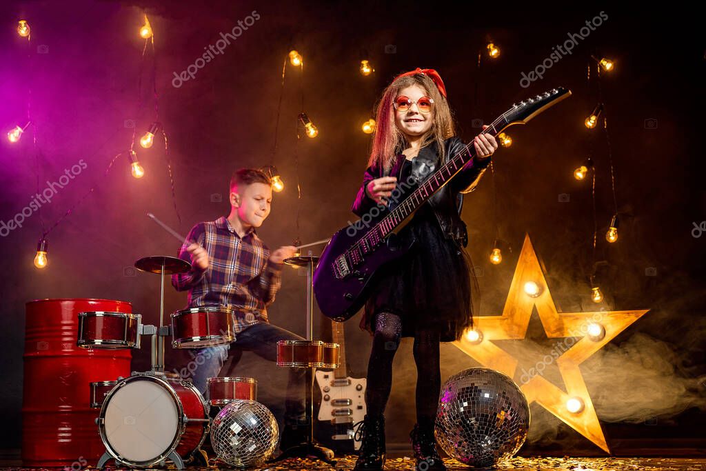 Kids pretending to be in a rock band and play and sing at studio or stage. Girl play on guitar and boy on drums.