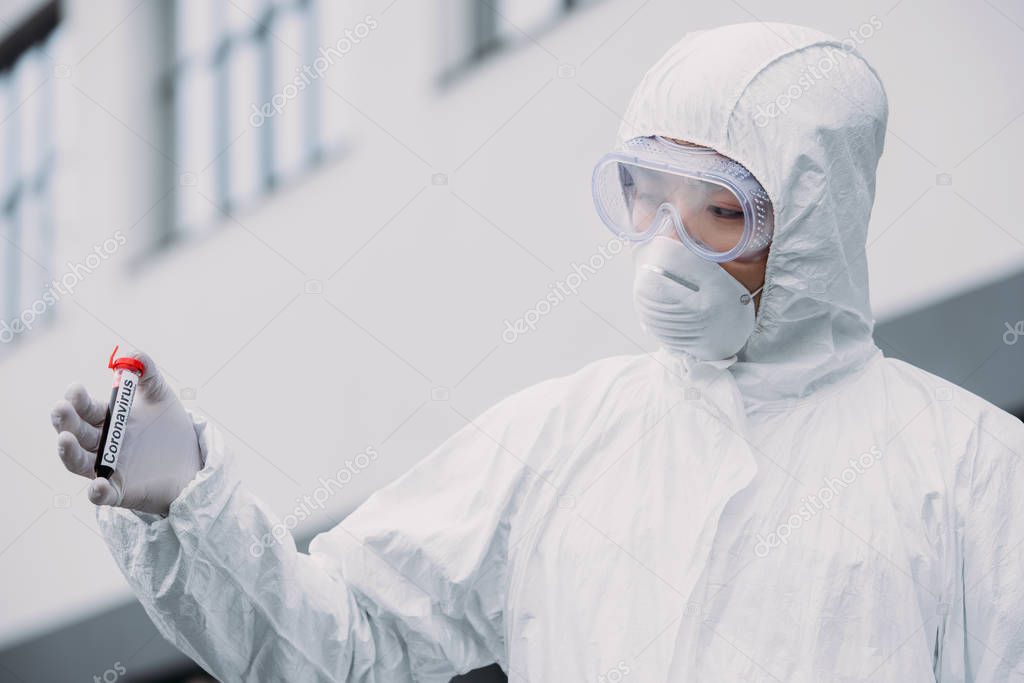 - asian epidemiologist in hazmat suit and respirator mask holding test tube with blood sample while standing outdoors
