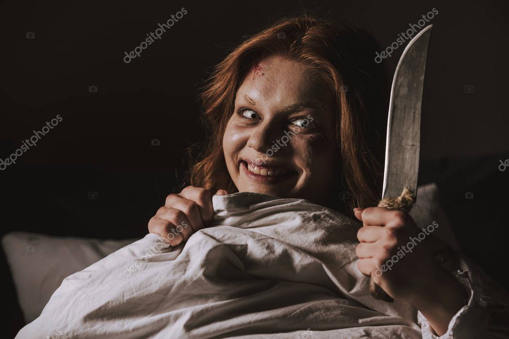 GIRL YOUNG SMILING CAUCASIAN SMILE KNIFE EUROPEAN DARK BED NIGHT HOLD WOMAN INDOORS DEATH EVIL HORROR CRAZY SCARY HALLOWEEN BEDROOM FEAR SPOOKY DEVIL DEMON NIGHTMARE GHOST INSANE DEAD TERRIBLE SATAN CREEPY DEMONIC POSSESSED OBSESSION DEMONIACAL OBSESSED EXORCISM DIABOLISM DEMONIAC COPY SPACE ONE PERSON PARANORMAL ACTIVITY