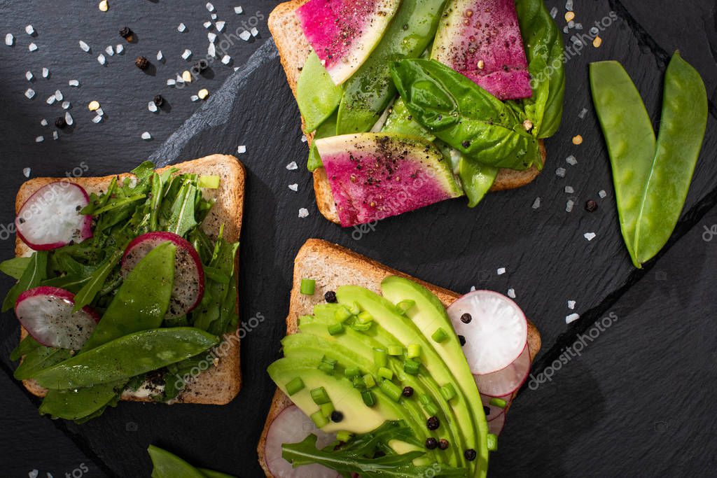 top view of fresh toasts with radish and avocado on stone board with pepper and salt