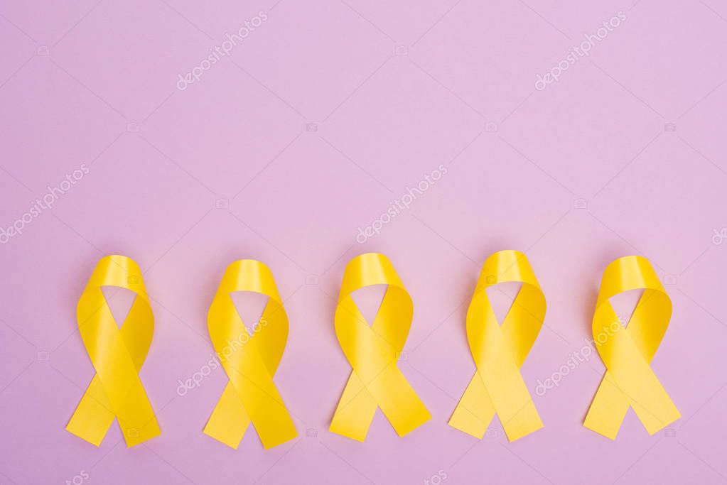 - Flat lay with yellow awareness ribbons on violet, international childhood cancer day concept