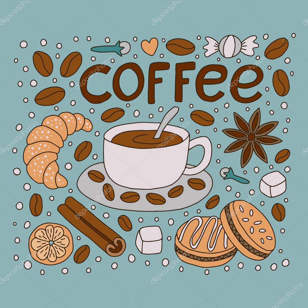 Coffee with desserts and drawn letters. Doodle style. Vector illustration.