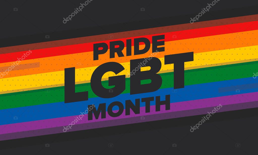 - LGBT Pride Month in June. Lesbian Gay Bisexual Transgender. Celebrated annual. LGBT flag. Rainbow love concept. Human rights and tolerance. Poster, card, banner and background. Vector ilustration