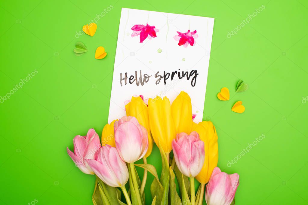 Top view of bouquet, card with hello spring lettering and decorative hearts on pink