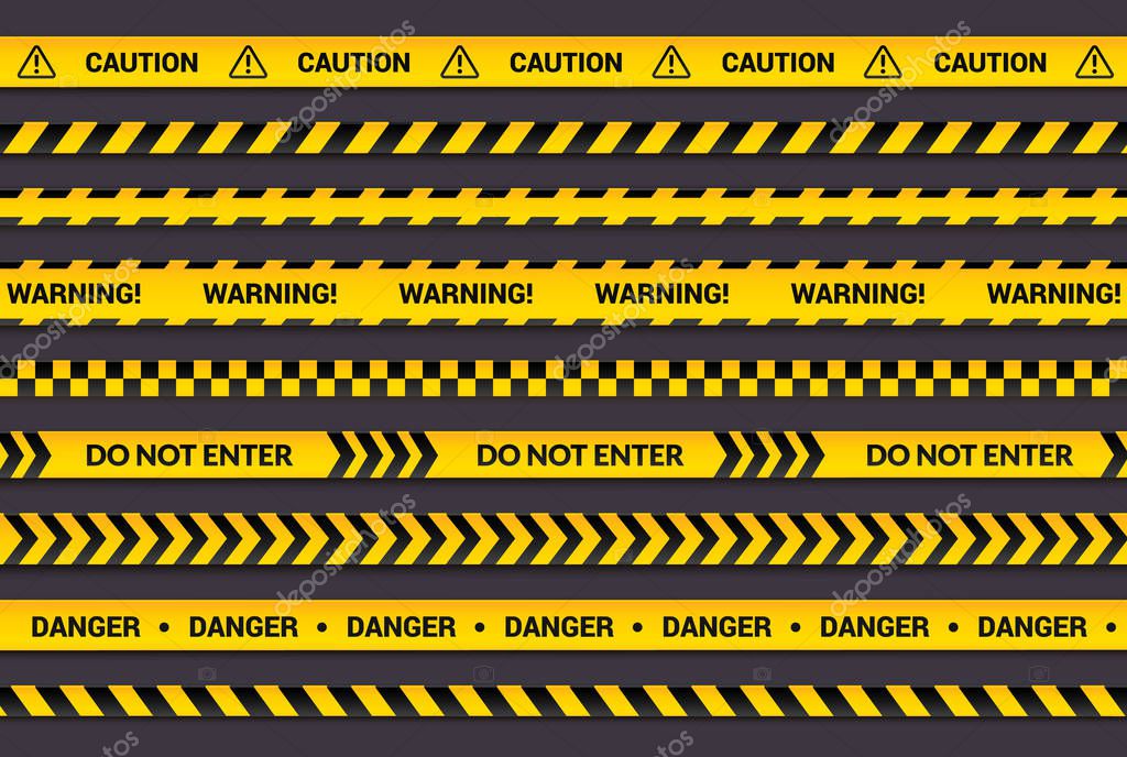 Caution tape set, yellow warning strips, danger symbol, arrows, yellow lines with black text and triangle sign. Horizontal banner collection with attention message.