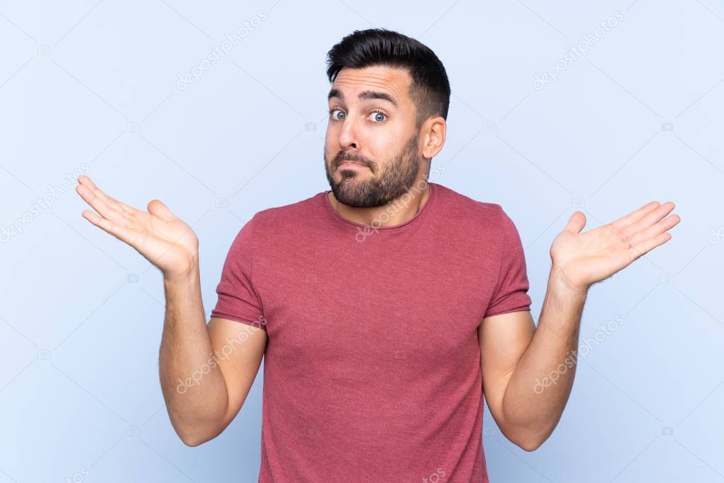 Young handsome man with beard over isolated blue background making doubts gesture