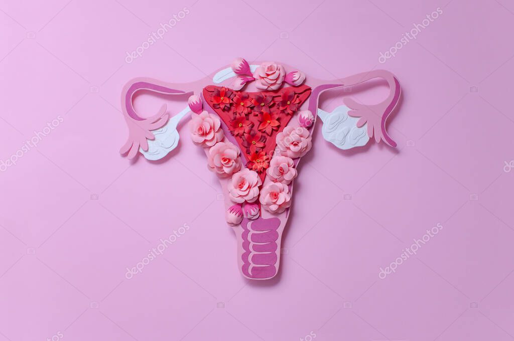 - Women's reproductive system, uterus and ovaries. Art concept of female reproductive health. Paper flowers, flat lay