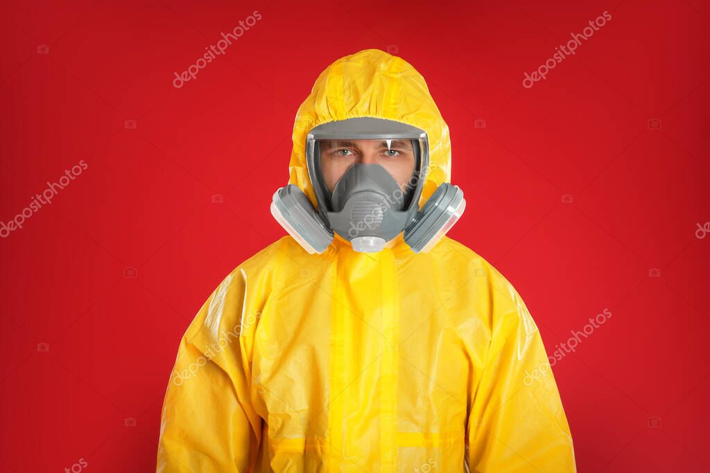 Man wearing chemical protective suit on red background. Prevention of virus spread
