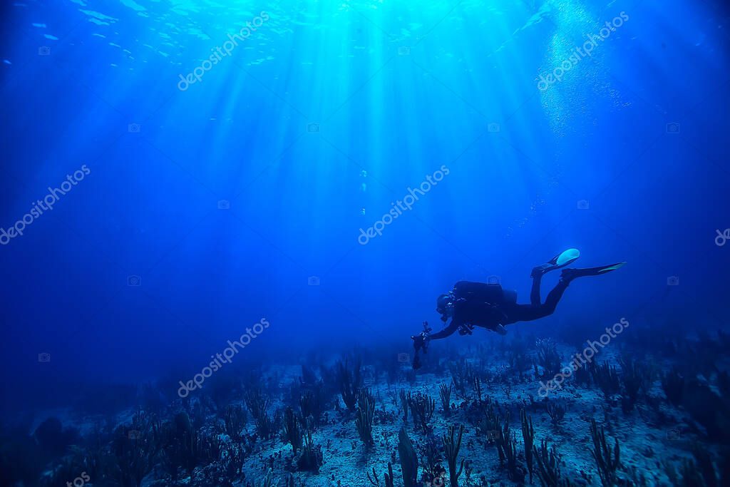 diver underwater unusual view, concept depth, diving in the sea