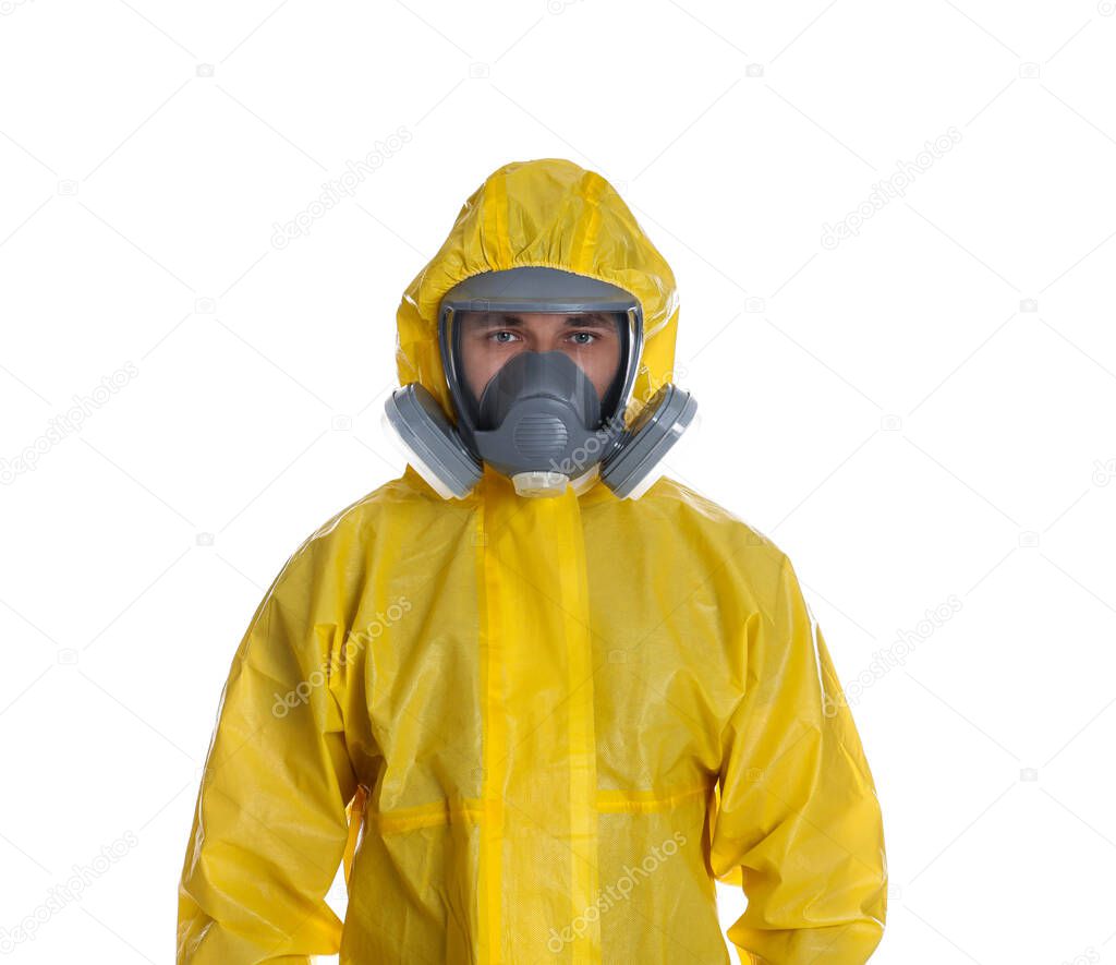 Man wearing chemical protective suit on white background. Prevention of virus spread