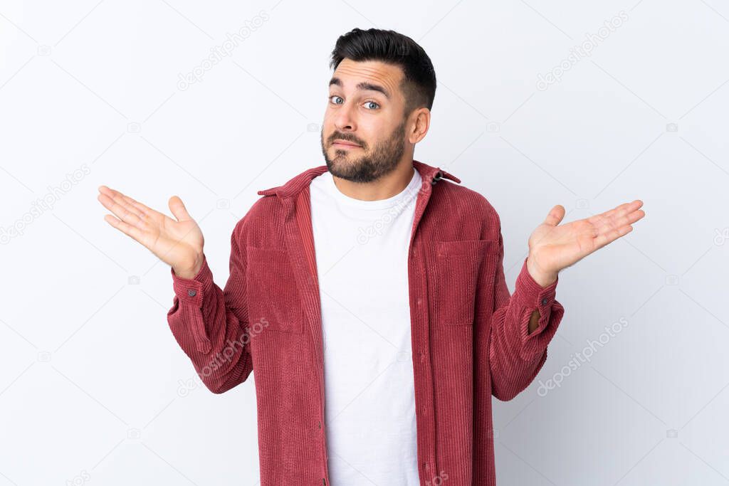 Young handsome man with beard wearing a corduroy jacket over isolated white background making doubts gesture