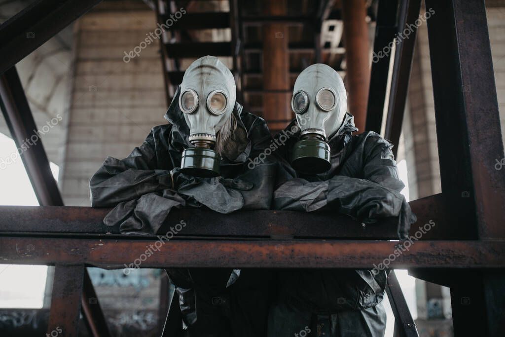 Couple in love stands under bridge in NBC protective suits and gas masks. Concept of a preventive measures and protection for coronavirus COVID 19 pandemic and other global dangers.