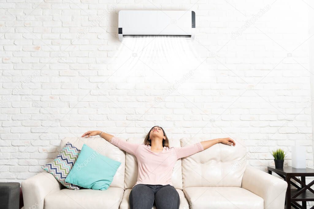 Latin young woman relaxing under mini split on sofa in living room at home