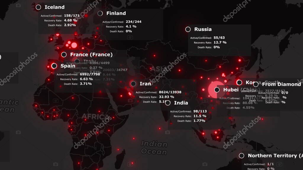 Pandemic of the coronavirus COVID 19 is spreading from wuhan in china over dark mainlands with red colored infected cities and statistics data. 3d rendering animated world map background in 4K video.
