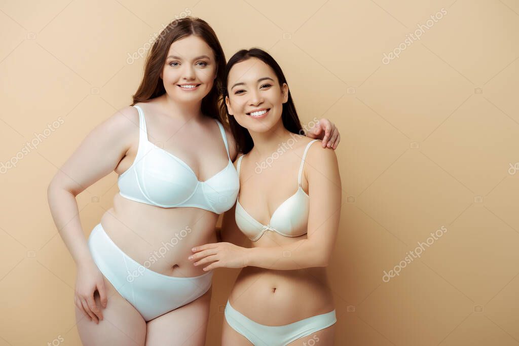 - plus size woman smiling with asian girl in underwear isolated on beige, body positive concept