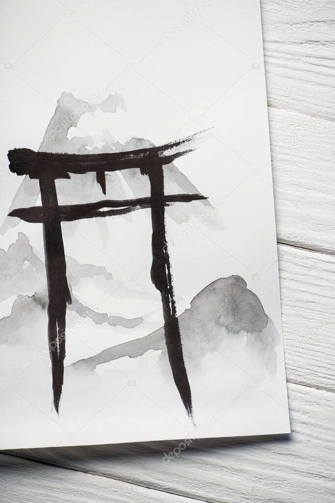 Top view of paper with painted black hieroglyph on wooden background
