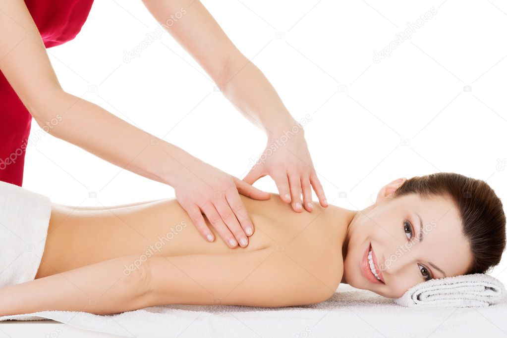 Preaty woman relaxing being massaged in spa saloon. Isolated on white.