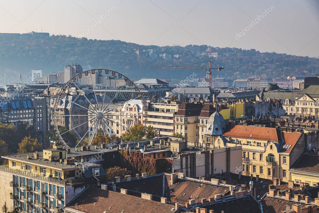 - Ferris wheel and old buildings rooftop view in Budapest city center