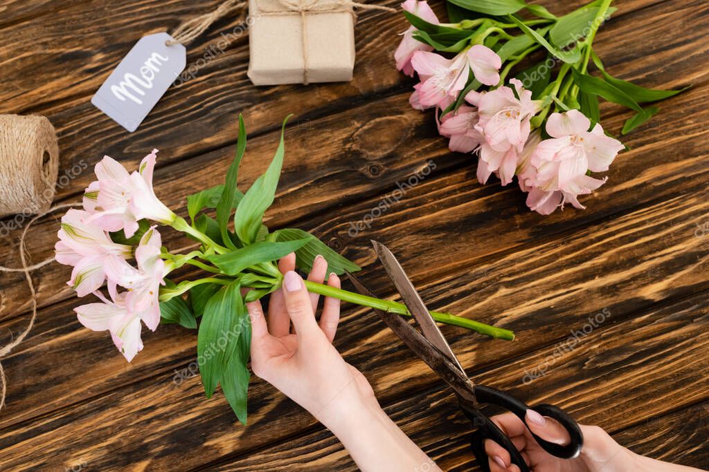 Top view of woman holding scissors near pink flowers, gift box and tag with mom lettering, mothers day concept