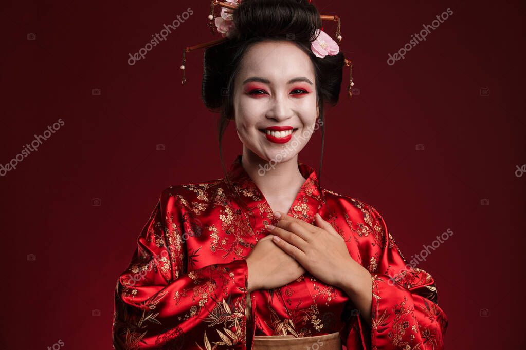 - Image of beautiful young geisha woman in traditional japanese kimono smiling isolated over red background