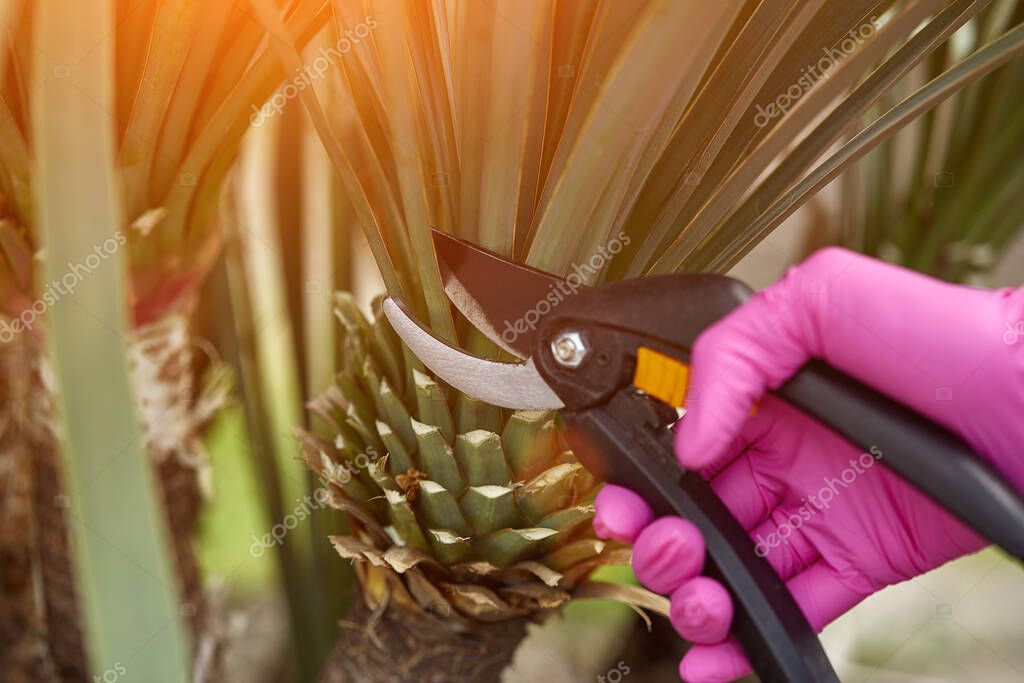 Yucca. Haircut yucca in the garden, garden secateurs. The gardener creates a yucca design. Work in the garden. Pruning plants.