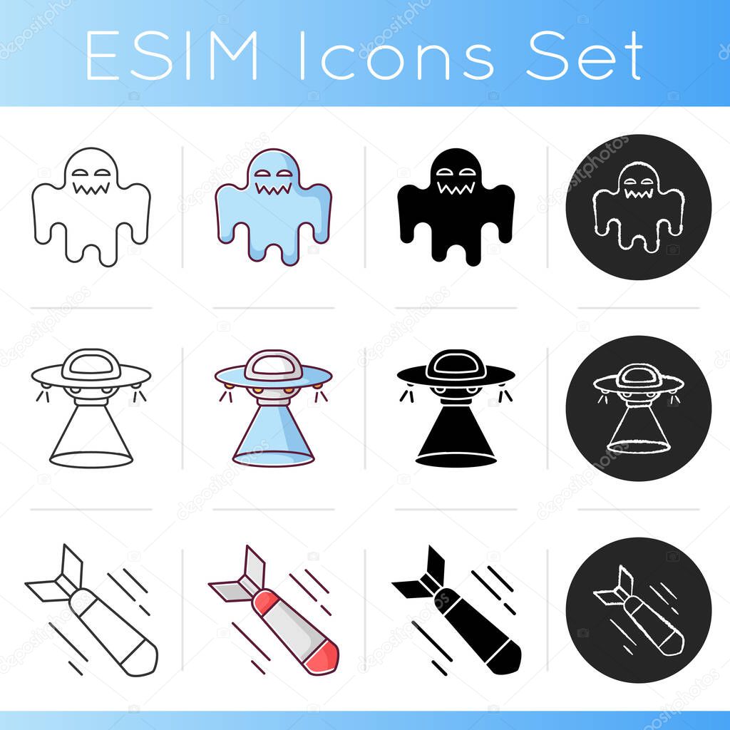 - Common movie categories icons set. Linear, black and RGB color styles. Popular cinematography genres, filmmaking styles. Science fiction, horror films and war dramas. Isolated vector illustrations