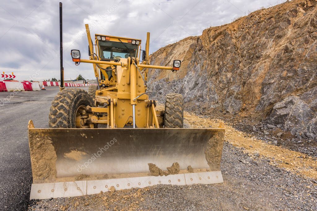 - Grader working on gravel leveling