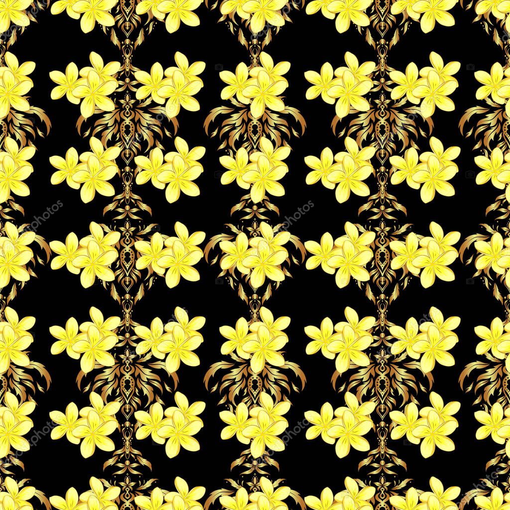 - Vector seamless pattern with plumeria flowers and gold on black background. Floral background with watercolor effect. Textile print for bed linen, jacket, package design, fabric and fashion concepts.