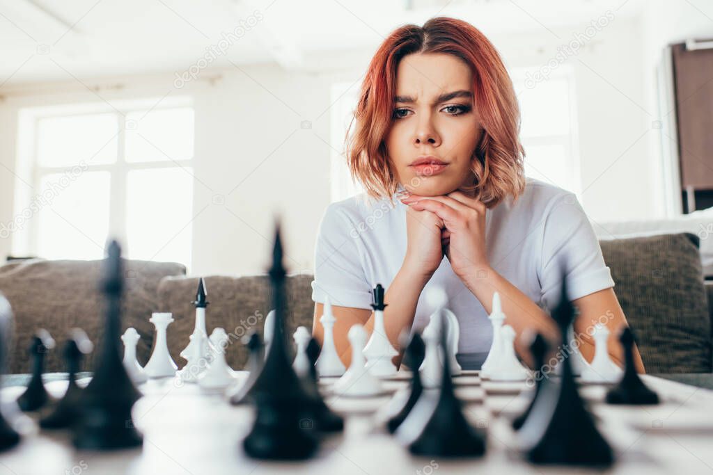 Thoughtful girl playing chess on self isolation, selective focus