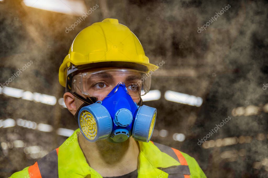 - A Engineer industry wearing safety uniform ,black gloves and gas mask under checking chemical tank in industry factory work.