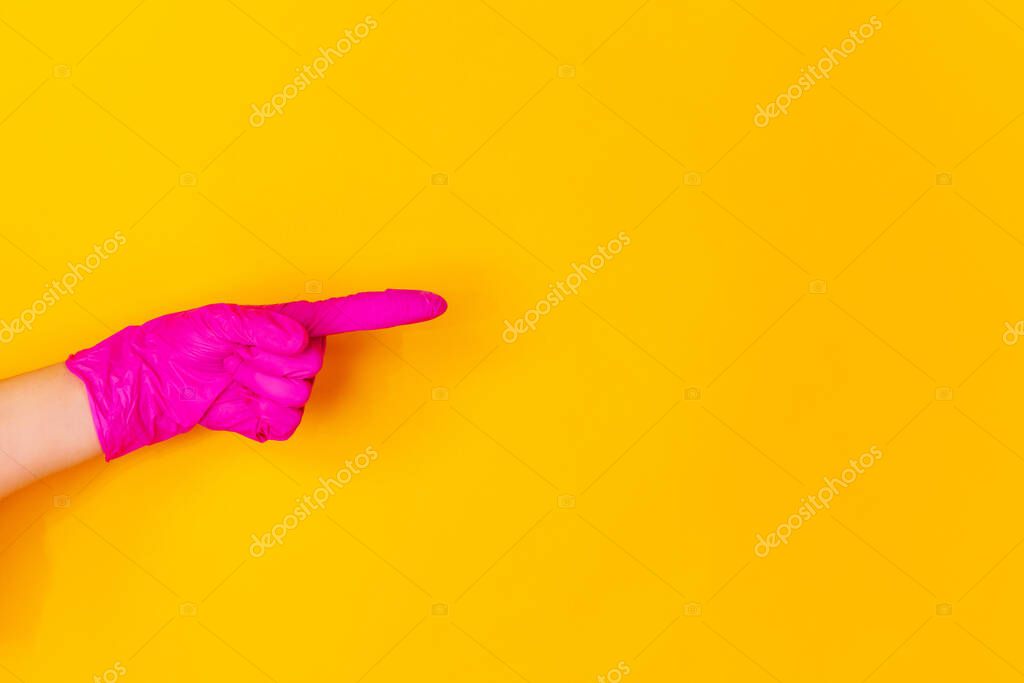 Hand in pink rubber glove pointing isolated on yellow studio background with copyspace.