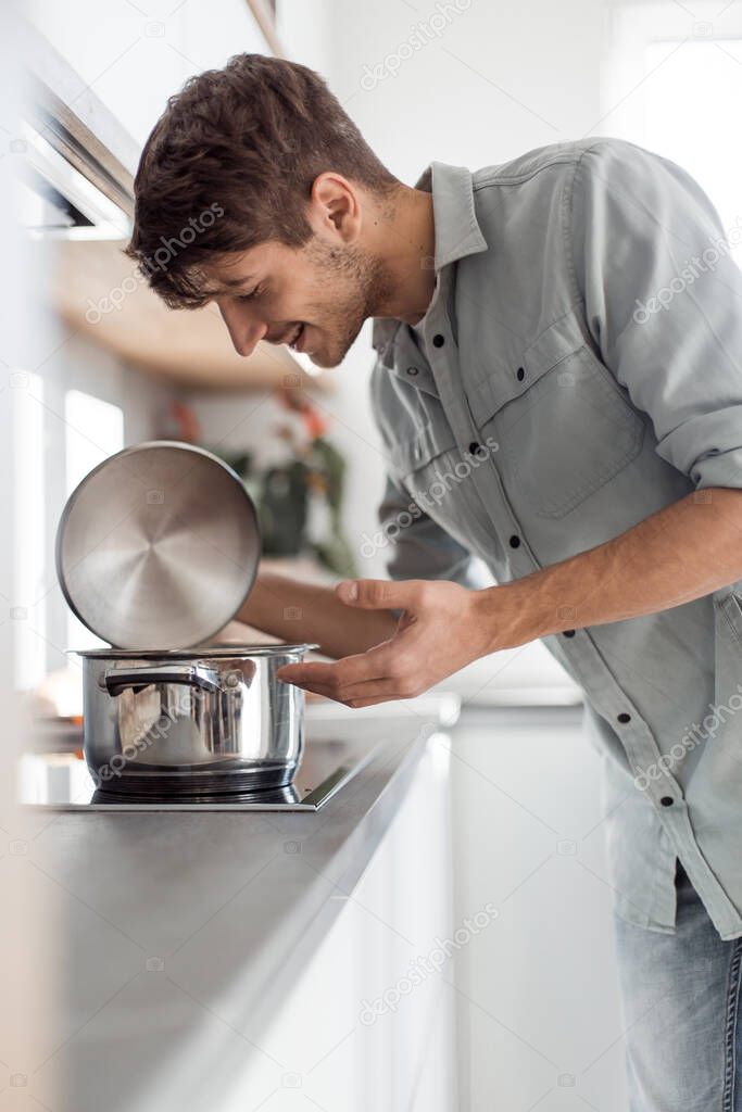 Rear view. smiling young employee sitting at his Desk and pointing at you
