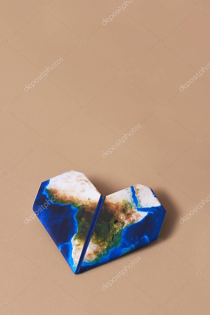 - origami heart, patterned with a map of Africa (furnished by NASA), on a brown background with some blank space on top