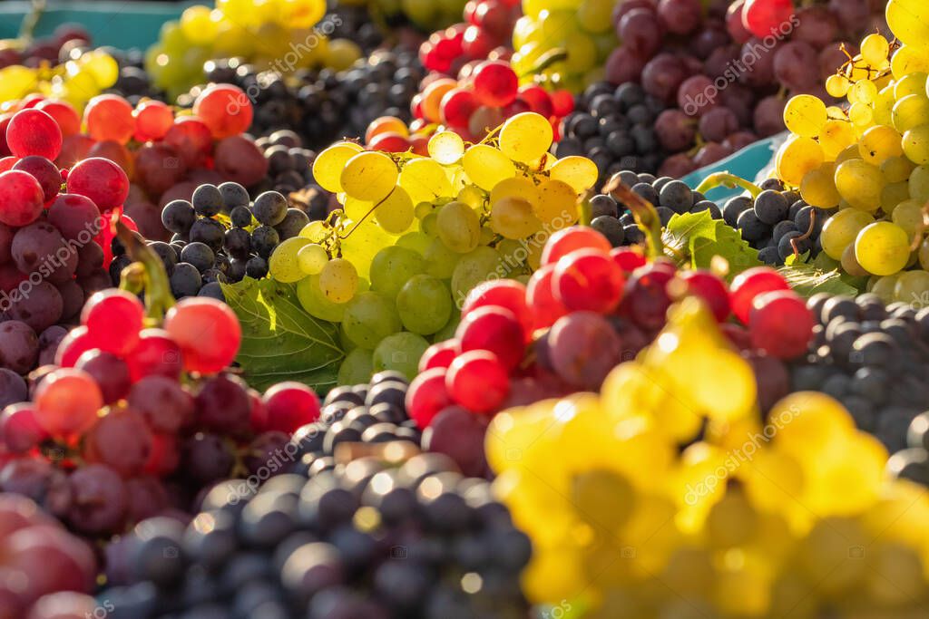 Fresh delicious grapes glows in the sun. Organic fruit market. Ripe grape fruits close up