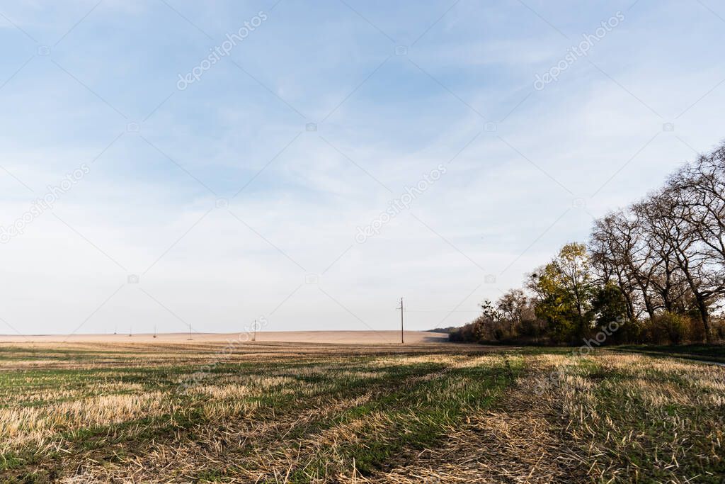 - grassy lawn, field and trees near power line against blue sky