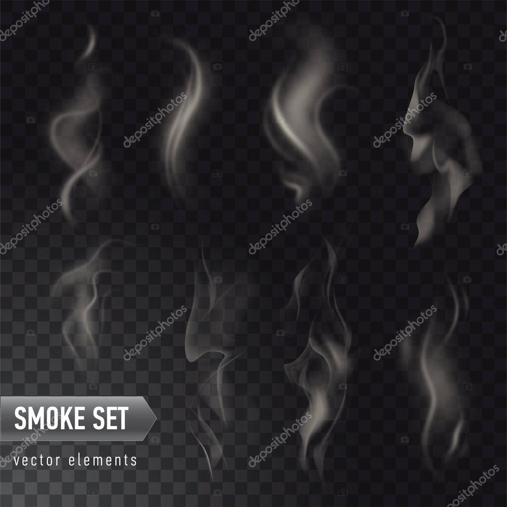 Collection of different realistic high detailed smokes from hot food or drink isolated on transparent background