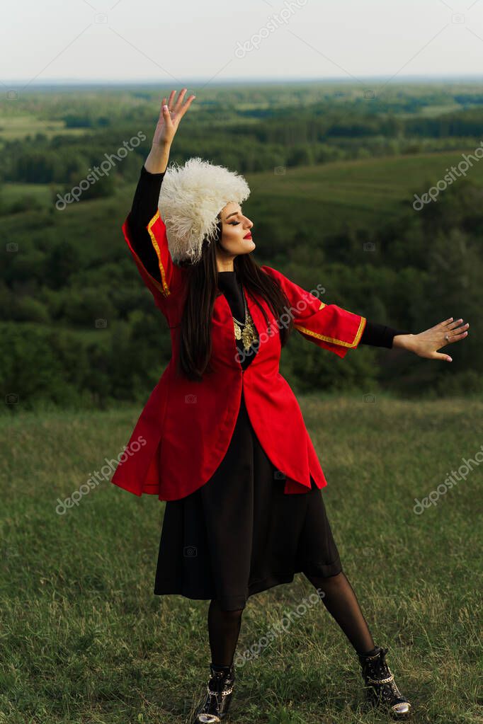 - Georgian girl in white papakha and red national dress dances national dance named: rachuli, acharuli, osuri, shalaxo, mtiuluri. on the green hills of Georgia background. Georgian culture lifestyle.