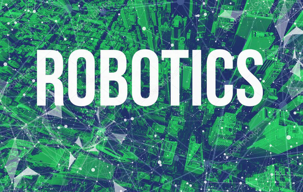 Robotics theme with abstract network patterns and Manhattan skyscrapers