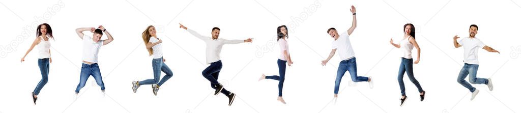 Collage of happy carefree millennials people jumping in air isolated on white background. Group of young smiling people fly